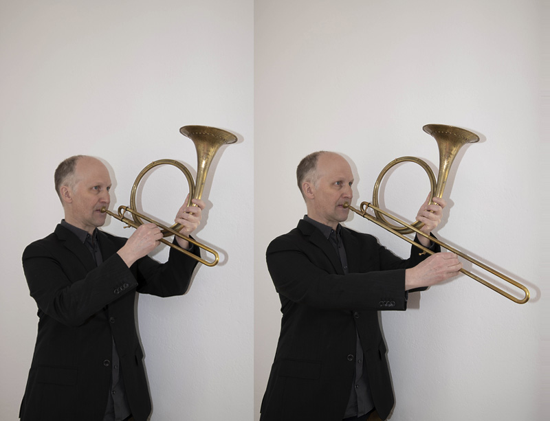 4. Nach Auswertung aller Indizien und Quellen, unter Berücksichtigung der menschlichen Anatomie (Armlänge) und anhand der gewonnenen Praxis-Erfahrungen, könnten die zusätzlichen Töne durch die Kombination der Instrumente mit einem Adapter, einem kurzen posaunenartigen Doppelzug hervorgebracht worden sein: Durch Ausziehen des Doppelzuges sind die gewünschten zusätzlichen Töne ausdrucksstark, klanglich einwandfrei und virtuos spielbar.